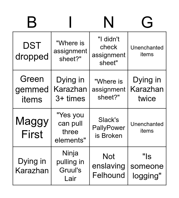 This bingo card has 22 words: Ninja pulling in Gruul's Lair, "Yes you can pull three elementals", "Where is assignment sheet?", Not full raid team, Dying in Karazhan 3+ times, "Where is assignment sheet?", DST dropped, "I didn't check assignment sheet", Slack's PallyPower is Broken, "Is someone logging", Maggy First, Unenchanted items, Getting Charged by Ogres, Cube Clicker Failed, Not enslaving Felhound, Green gemmed items, Unenchanted items, Dying in Karazhan, "Yes you can pull three elements", Green gemmed items, Dying in Karazhan twice and Dying in Karazhan 3+ times.