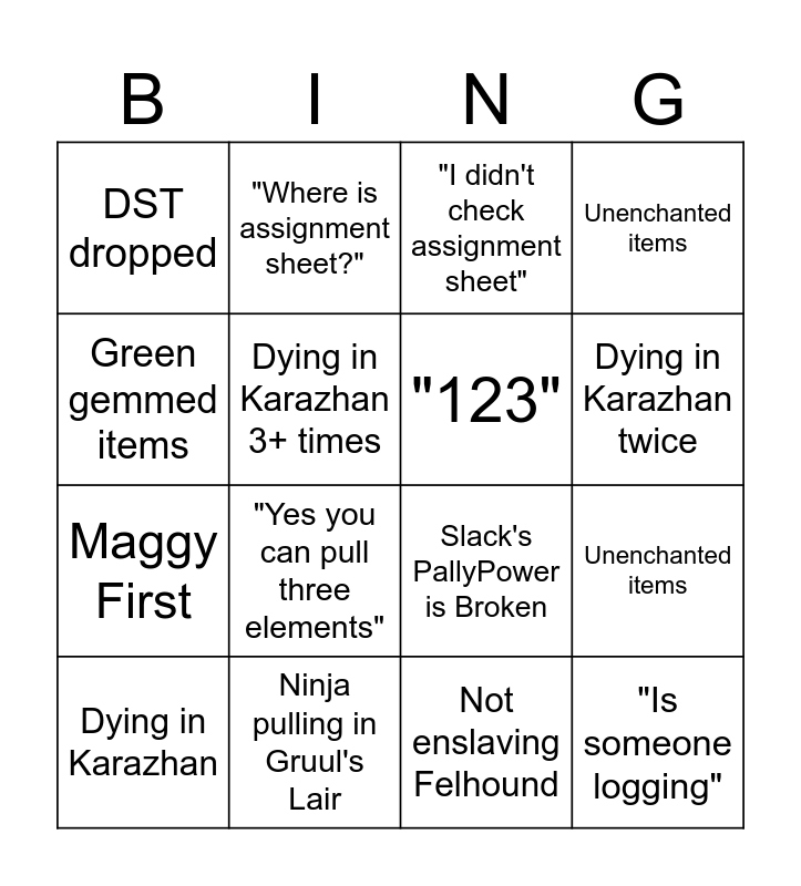 This bingo card has 22 words: Ninja pulling in Gruul's Lair, "Yes you can pull three elementals", "Where is assignment sheet?", Not full raid team, Dying in Karazhan 3+ times, "123", DST dropped, "I didn't check assignment sheet", Slack's PallyPower is Broken, "Is someone logging", Maggy First, Unenchanted items, Getting Charged by Ogres, Eating Novas on Magtheridon, Not enslaving Felhound, Green gemmed items, Unenchanted items, Dying in Karazhan, "Yes you can pull three elements", Green gemmed items, Dying in Karazhan twice and Dying in Karazhan 3+ times.