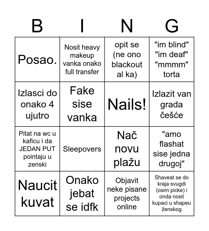 This bingo card has 16 words: Onako jebat se idfk, "amo flashat sise jedna drugoj", opit se (ne ono blackout al ka), Posao., Pitat na wc u kaficu i da JEDAN PUT pointaju u zenski, Nosit heavy makeup vanka onako full transfer, Nač novu plažu, Objavit neke pisane projects online, Izlasci do onako 4 ujutro, Fake sise vanka, Naucit kuvat, "im blind" "im deaf" "mmmm" torta, Sleepovers, Izlazit van grada češće, Nails! and Shaveat se do kraja svugdi (osim picke) i onda nosit kupaci u shapeu ženskog.