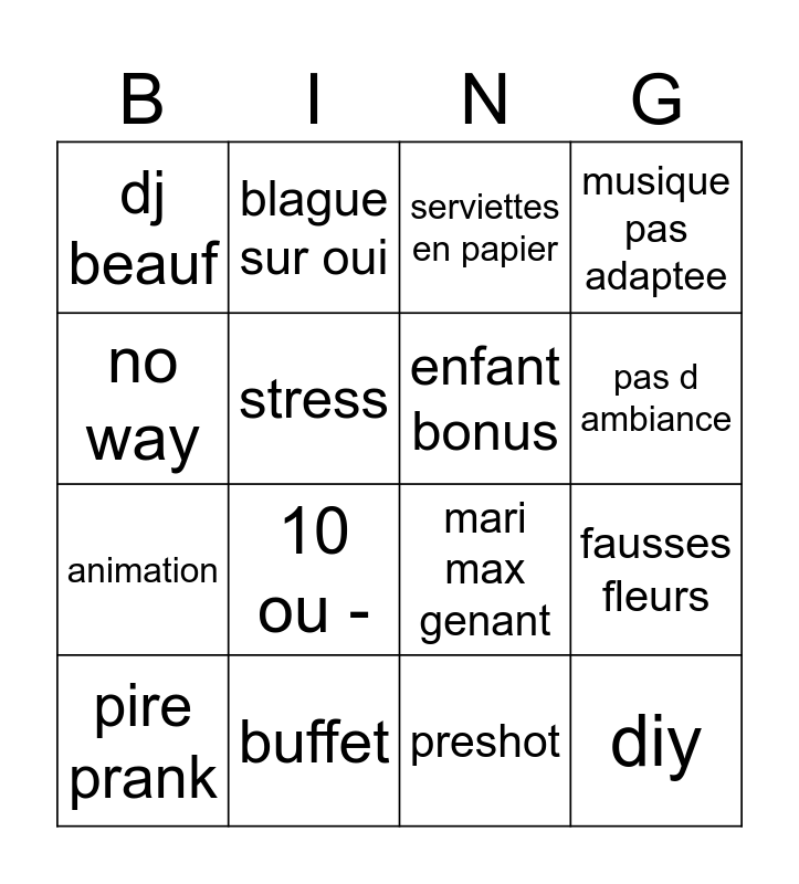 This bingo card has 16 words: buffet, fausses fleurs, serviettes en papier, dj beauf, animation, blague sur oui, mari max genant, preshot, no way, stress, pire prank, musique pas adaptee, 10 ou -, pas d ambiance, enfant bonus and diy.