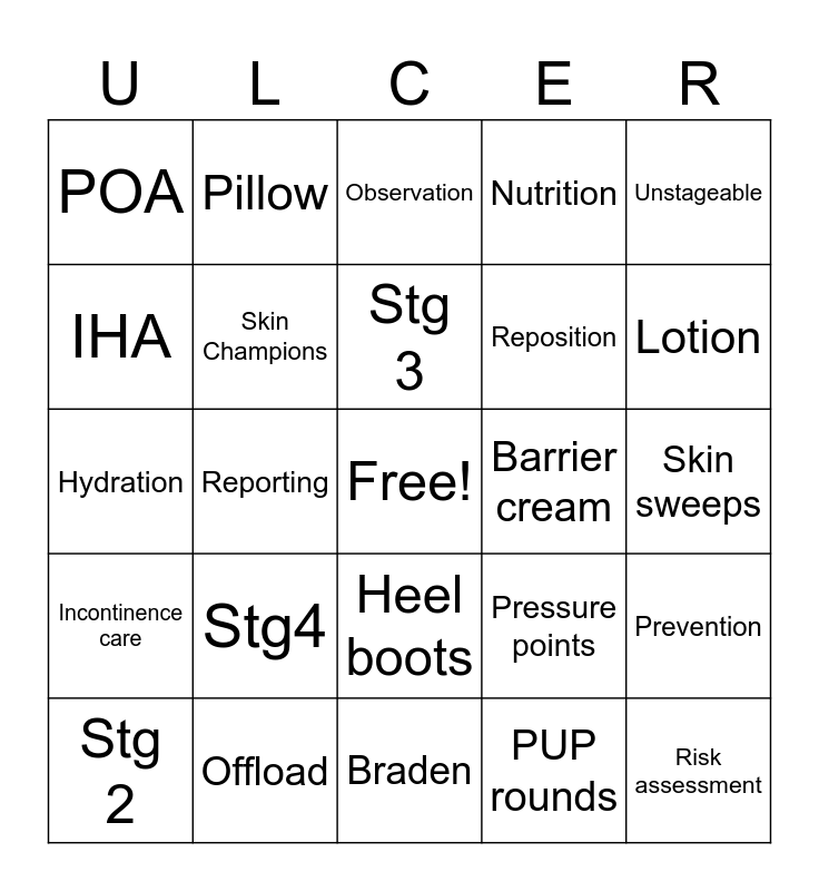 This bingo card has a free space and 24 words: Stg4, Offload, Stg 3, Stg 2, Unstageable, POA, IHA, Pillow, Barrier cream, Heel boots, Reposition, Hydration, Pressure points, Prevention, Skin Champions, PUP rounds, Skin sweeps, Observation, Lotion, Reporting, Risk assessment, Incontinence care, Nutrition and Braden.