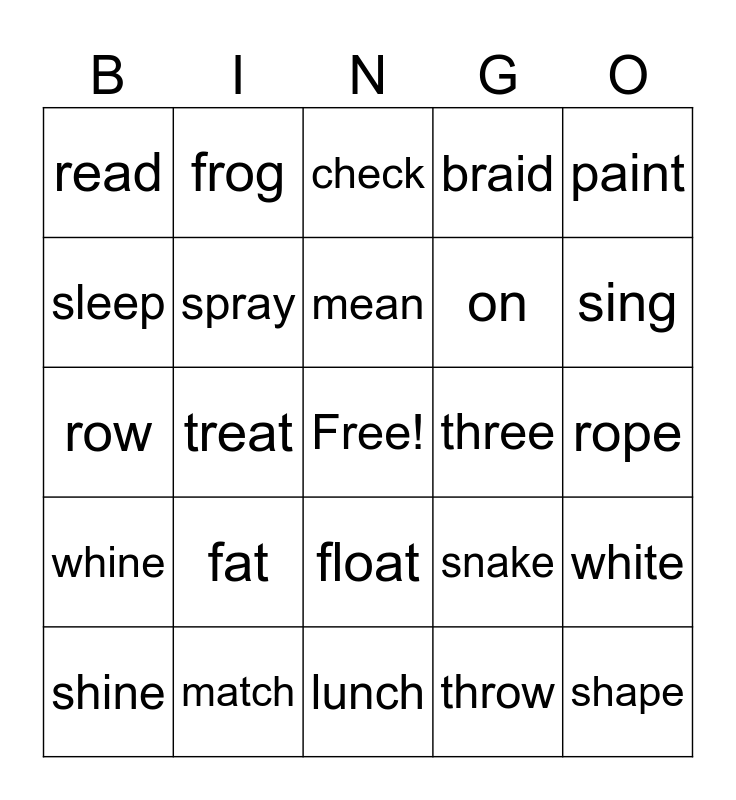 This bingo card has a free space and 35 words: wheel, chair, eat, spray, float, braid, sleep, seal, mean, cheese, row, paint, reach, roast, read, three, throw, treat, whine, shape, snake, shine, white, match, check, sing, trap, swing, on, rope, class, lunch, fat, frog and wing.