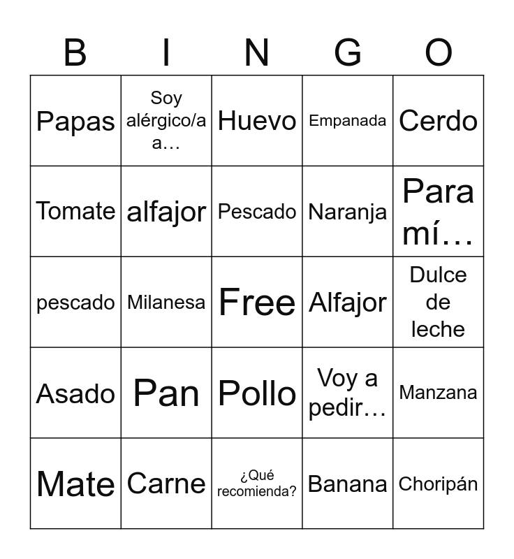 This bingo card has a free space and 40 words: manzana, pescado, carne, alfajor, Carne, Pollo, Pescado, Carne de res, Cerdo, Asado, Milanesa, Empanada, Choripán, Dulce de leche, Alfajor, Pan, Arroz, Papas, Ensalada, Huevo, Manzana, Banana, Naranja, Tomate, Lechuga, Zanahoria, Agua, Jugo, Gaseosa, Café, Té, Mate, Quisiera…, Voy a pedir…, Para mí…, ¿Qué recomienda?, ¿Cuánto cuesta?, ¿Qué es esto?, Soy alérgico/a a… and Vegetariano/a.