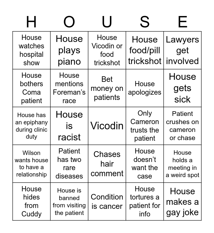 This bingo card has a free space and 35 words: House sexualizes Cuddy, House is sexist, Wilson psycho-analyses House, House mentions Foreman’s race, Chases hair comment, House food/pill trickshot, House bothers Coma patient, Ducklings break into someones home, Bet money on patients, Somebody’s having an affair, House has an epiphany during clinic duty, Lawyers get involved, Surgery is interrupted, Patient cant breathe, House watches hospital show, Only Cameron trusts the patient, House tortures a patient for info, House is racist, Wilson wants house to have a relationship, House makes a gay joke, House doesn’t want the case, House hides from Cuddy, House holds a meeting in a weird spot, House is banned from visiting the patient, House Vicodin or food trickshot, House gets sick, Patient has no visitors, House gets hit, House apologizes, Patient crushes on cameron or chase, Un-consensual test, Condition is cancer, Patient has two rare diseases, House plays piano and House sits and listens to music.