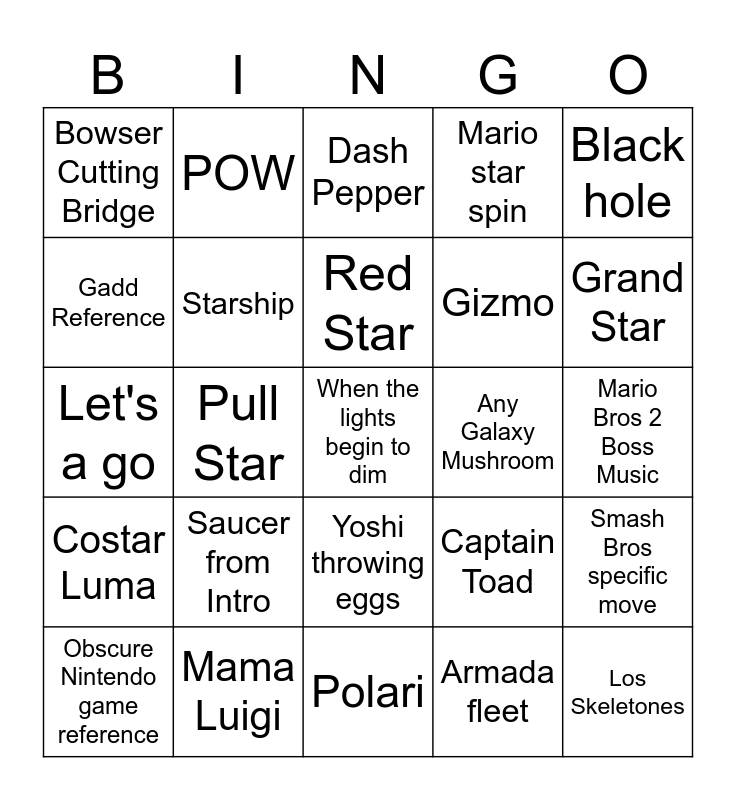 This bingo card has a free space and 24 words: Saucer from Intro, Mama Luigi, Red Star, Obscure Nintendo game reference, Black hole, Bowser Cutting Bridge, Gadd Reference, POW, Any Galaxy Mushroom, Yoshi throwing eggs, Gizmo, Let's a go, Captain Toad, Smash Bros specific move, Starship, Armada fleet, Mario Bros 2 Boss Music, Dash Pepper, Grand Star, Pull Star, Los Skeletones, Costar Luma, Mario star spin and Polari.