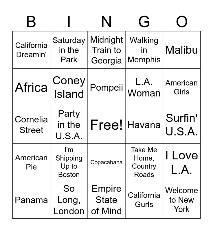This bingo card has a free space and 50 words: Location, Welcome to New York, Theme from New York, Empire State of Mind, I'm Shipping Up to Boston, Boston, Saturday in the Park, Hotel California, Africa, Paris, Coney Island, Walking in Memphis, I Love L.A., Take Me Home, Country Roads, Vienna, Budapest, Pompeii, Havana, Galway Girl, Malibu, Party in the U.S.A., California Gurls, California Dreamin', L.A. Woman, Viva Las Vegas, American Woman, American Girls, Born in the U.S.A., Midnight Train to Georgia, Copacabana, Montana Sky, Werewolves of London, London Bridge, Waking Up In Vegas, So Long, London, Florida!!!, Penny Lane, Beverly Hills, San Fransisco, Surfin' U.S.A., Back in the U.S.S.R., Georgia, Lovers in Japan, Portugal, Panama, Cornelia Street, London Boy, Maine, American Pie and Island in the Sun.