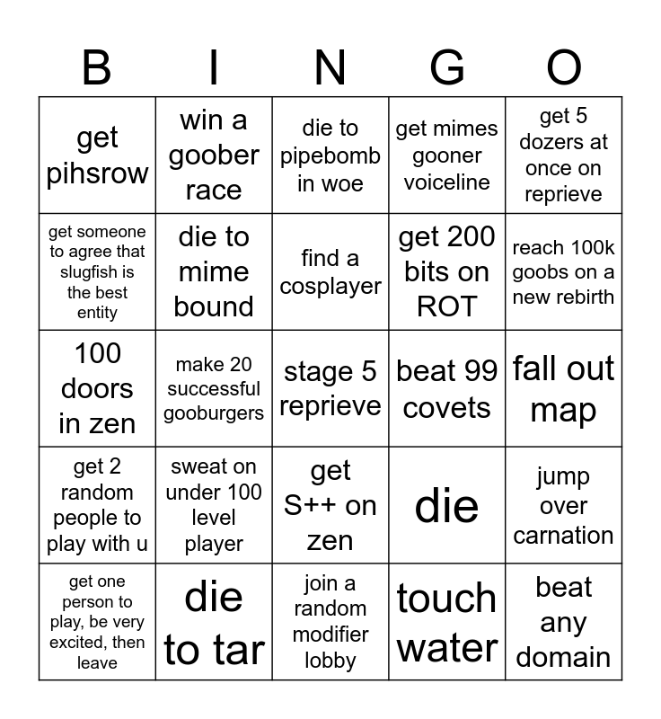 This bingo card has 25 words: sweat on under 100 level player, join a random modifier lobby, find a cosplayer, get one person to play, be very excited, then leave, get 5 dozers at once on reprieve, get pihsrow, get someone to agree that slugfish is the best entity, win a goober race, beat 99 covets, get S++ on zen, get 200 bits on ROT, 100 doors in zen, die, jump over carnation, die to mime bound, beat any domain, fall out map, die to pipebomb in woe, reach 100k goobs on a new rebirth, make 20 successful gooburgers, stage 5 reprieve, die to tar, get 2 random people to play with u, get mimes gooner voiceline and touch water.