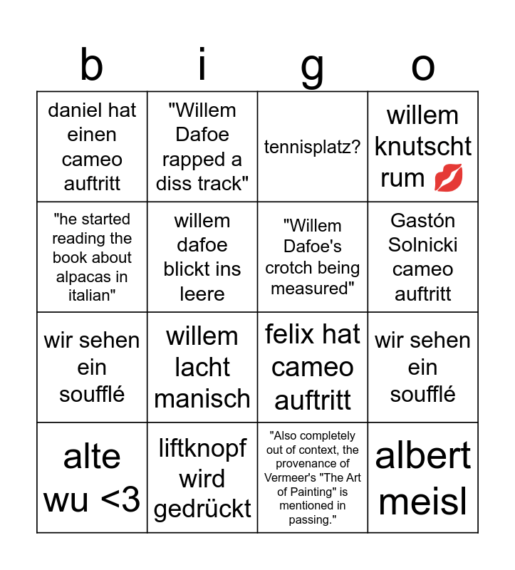 This bingo card has 16 words: liftknopf wird gedrückt, wir sehen ein soufflé, tennisplatz?, daniel hat einen cameo auftritt, wir sehen ein soufflé, "Willem Dafoe rapped a diss track", felix hat cameo auftritt, "Also completely out of context, the provenance of Vermeer's "The Art of Painting" is mentioned in passing.", "he started reading the book about alpacas in italian", willem dafoe blickt ins leere, alte wu <3, willem knutscht rum 💋, willem lacht manisch, Gastón Solnicki cameo auftritt, "Willem Dafoe's crotch being measured" and albert meisl.