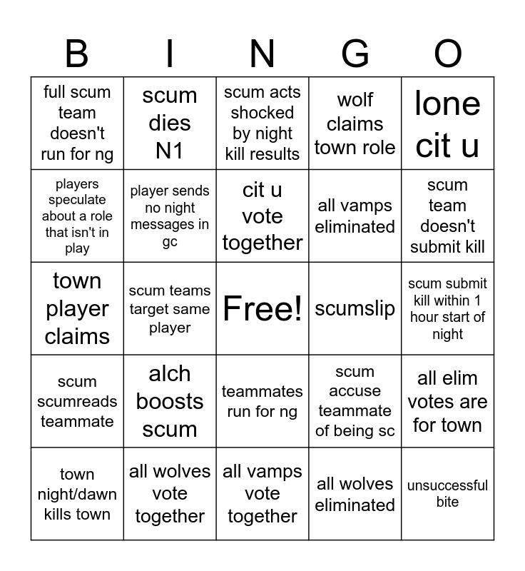 This bingo card has a free space and 28 words: all elim votes are for town, all town eliminated, all vamps eliminated, all wolves eliminated, players speculate about a role that isn't in play, scum acts shocked by night kill results, scum dies N1, scum scumreads teammate, scumslip, town night/dawn kills town, town player claims, wolf claims town role, all wolves vote together, all vamps vote together, scum team doesn't submit kill, MA swap changes kill, alch boosts scum, player sends no night messages in gc, cit u vote together, teammates run for ng, full scum team doesn't run for ng, town discussing only town elim candidates, unsuccessful bite, scum teams target same player, scum submit kill within 1 hour start of night, scum accuse teammate of being sc, lone cit u and lone gc member strategizes in gc.