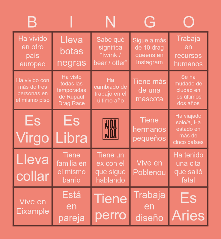 This bingo card has a free space and 129 words: Lleva zapatillas blancas, Lleva botas negras, Va vestido/a completamente de negro, Lleva algo rojo, Lleva más de un anillo, Lleva reloj, Lleva pendientes grandes, Lleva collar, Lleva bolso pequeño, Lleva mochila, Lleva chaqueta, Lleva manga corta, Tiene un tatuaje visible, Tiene más de un tatuaje visible, Tiene un piercing visible, Lleva el pelo recogido, Lleva el pelo suelto, Tiene perro, Tiene gato, Tiene un perro pequeño, Tiene un perro grande, Tiene un gato negro, Tiene más de una mascota, Tiene una mascota adoptada, Tiene mascota desde hace más de 5 años, Ha tenido perro de pequeño, Ha tenido gato de pequeño, Es Aries, Es Leo, Es Escorpio, Es Géminis, Es Virgo, Es Libra, Es Piscis, Es Capricornio, Es Acuario, Es Tauro, Tiene hermanos, Tiene más de dos hermanos, Es hijo/a único/a, Tiene hermanos mayores, Tiene hermanos pequeños, Tiene sobrinos, Tiene familia en otra comunidad autónoma, Tiene familia en Galicia, Tiene familia fuera de España, Tiene padres de ciudades diferentes, Tiene un hermano/a viviendo fuera de España, Tiene familia en el mismo barrio, Vive en Barcelona ciudad, Vive en Poblenou, Vive en Gràcia, Vive en Eixample, No es de Barcelona, Lleva menos de dos años en Barcelona, Lleva más de cinco años en Barcelona, Vive solo/a, Comparte piso con amigos, Comparte piso con desconocidos, Vive con su pareja, Vive con sus padres, Tiene balcón en casa, Tiene terraza en casa, Tarda más de 30 minutos en ir al trabajo, Ha vivido fuera de España, Ha vivido en Londres, Ha vivido en otro país europeo, Ha vivido en América, Ha vivido en más de dos ciudades, Se ha mudado de ciudad en los últimos dos años, Ha vivido con más de tres personas en el mismo piso, Ha tenido más de cinco compañeros de piso, Ha viajado solo/a, Ha estado en más de cinco países, Ha cogido un avión este año, Ha ido a un festival este año, Ha vivido en otra ciudad de España, Trabaja en marketing, Trabaja en tecnología, Trabaja en una startup, Trabaja en una empresa grande, Trabaja en ventas, Trabaja en diseño, Trabaja en recursos humanos, Trabaja en finanzas, Trabaja en hostelería, Ha cambiado de trabajo en el último año, Está soltero/a, Está en pareja, Ha tenido más de tres parejas, Ha tenido una relación de más de tres años, Ha vivido con una pareja, Ha tenido una relación a distancia, Tiene un ex viviendo en Barcelona, Tiene un ex con el que sigue hablando, Ha tenido una cita por una app, Ha venido hoy con alguien que conoció hace menos de un mes, Ha ido a una Pride (Orgullo) fuera de España, Tiene una bandera LGTBIQ+ en casa, Sabe qué significa “twink / bear / otter”, Ha visto todas las temporadas de Rupaul Drag Race, Ha comprado el libro de Pitita Queen, Sabe el chisme entre Kika Lorace y La Sastrería, Sigue a más de 10 drag queens en Instagram, Ha escuchado a Lady Gaga hoy, Ha llorado con una canción de Lana Del Rey, Usa Grindr / Tinder / Bumble / Hinge / Meetic…, Ha tenido una cita que salió fatal, Ha ghosteado a alguien, Le han hecho ghosting, Lleva algo con animalprint, Lleva uñas acrílicas o largas, Lleva algo vintage / de segunda mano, Tiene el pelo de color fantasía (o lo ha tenido), Lleva crop top, Se ha hecho fotos hoy antes de salir, Ha tenido una “crisis de identidad”, Ha tenido un crush imposible, Ha tenido un crush con un/a amigo/a, Ha ido solo/a de fiesta, Tiene más de 10 pestañas abiertas en el móvil ahora mismo, Ha perdido algo en una fiesta, Ha enviado un audio de más de 2 minutos hoy, Ha stalkeado a alguien en las últimas 48h, Llega tarde habitualmente, Ha visto todas las películas de Almodóvar, Ha ido a Eurovisión alguna vez, Conoce la canción de ‘El Noa Noa’, Es/Ha sido dragqueen, Va al concierto de Rosalía and Lleva una prenda vaquera.