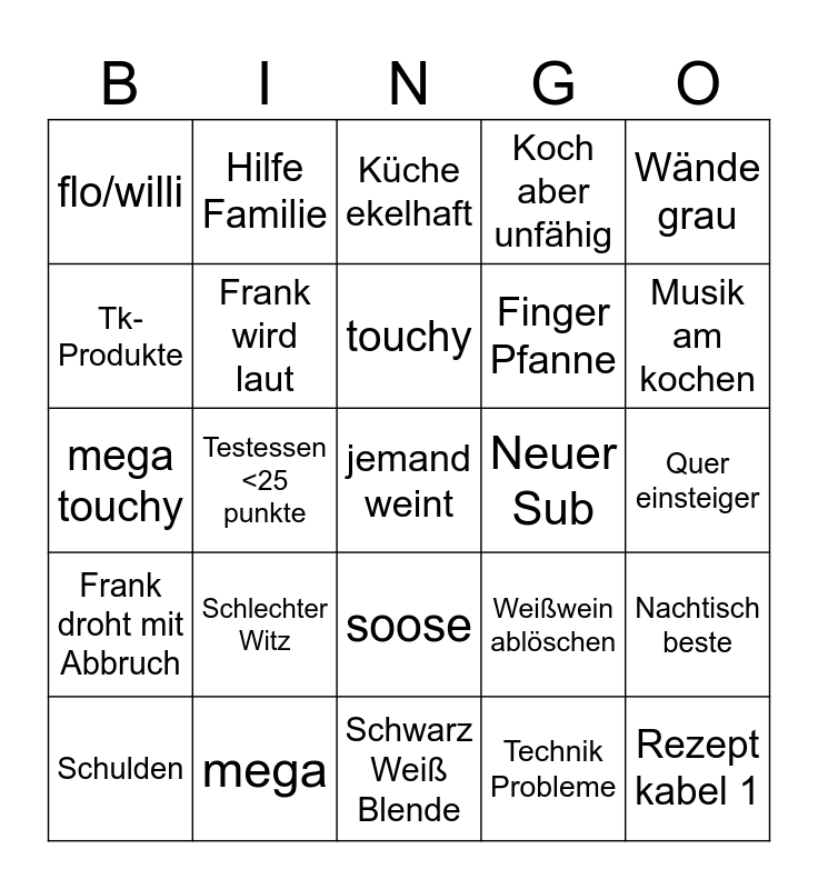 This bingo card has a free space and 24 words: Schlechter Witz, mega, touchy, Schulden, Wände grau, flo/willi, Tk-Produkte, Hilfe Familie, Neuer Sub, soose, Finger Pfanne, mega touchy, Weißwein ablöschen, Nachtisch beste, Frank wird laut, Technik Probleme, Quer einsteiger, Küche ekelhaft, Musik am kochen, Testessen <25 punkte, Rezept kabel 1, Frank droht mit Abbruch, Koch aber unfähig and Schwarz Weiß Blende.