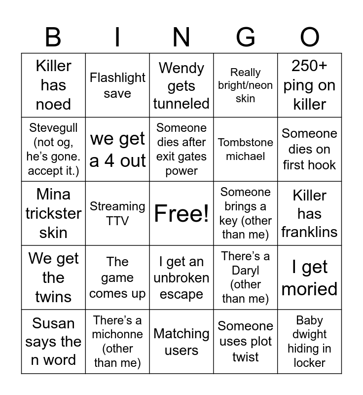 This bingo card has a free space and 24 words: The game comes up, There’s a michonne (other than me), Someone dies after exit gates power, Susan says the n word, 250+ ping on killer, Killer has noed, Stevegull (not og, he’s gone. accept it.), Flashlight save, Someone brings a key (other than me), I get an unbroken escape, Tombstone michael, Mina trickster skin, There’s a Daryl (other than me), I get moried, we get a 4 out, Someone uses plot twist, Killer has franklins, Wendy gets tunneled, Someone dies on first hook, Streaming TTV, Baby dwight hiding in locker, We get the twins, Really bright/neon skin and Matching users.