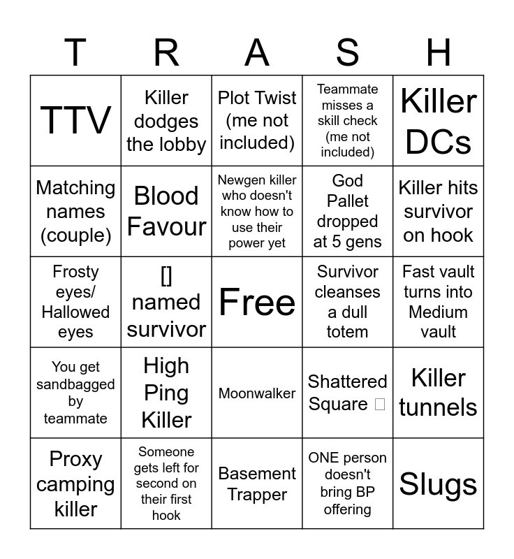 This bingo card has a free space and 24 words: High Ping Killer, Someone gets left for second on their first hook, Newgen killer who doesn't know how to use their power yet, Proxy camping killer, Killer DCs, TTV, Matching names (couple), Killer dodges the lobby, Survivor cleanses a dull totem, Moonwalker, God Pallet dropped at 5 gens, Frosty eyes/ Hallowed eyes, Shattered Square , Killer tunnels, Blood Favour, ONE person doesn't bring BP offering, Fast vault turns into Medium vault, Plot Twist (me not included), Killer hits survivor on hook, [] named survivor, Slugs, You get sandbagged by teammate, Teammate misses a skill check (me not included) and Basement Trapper.