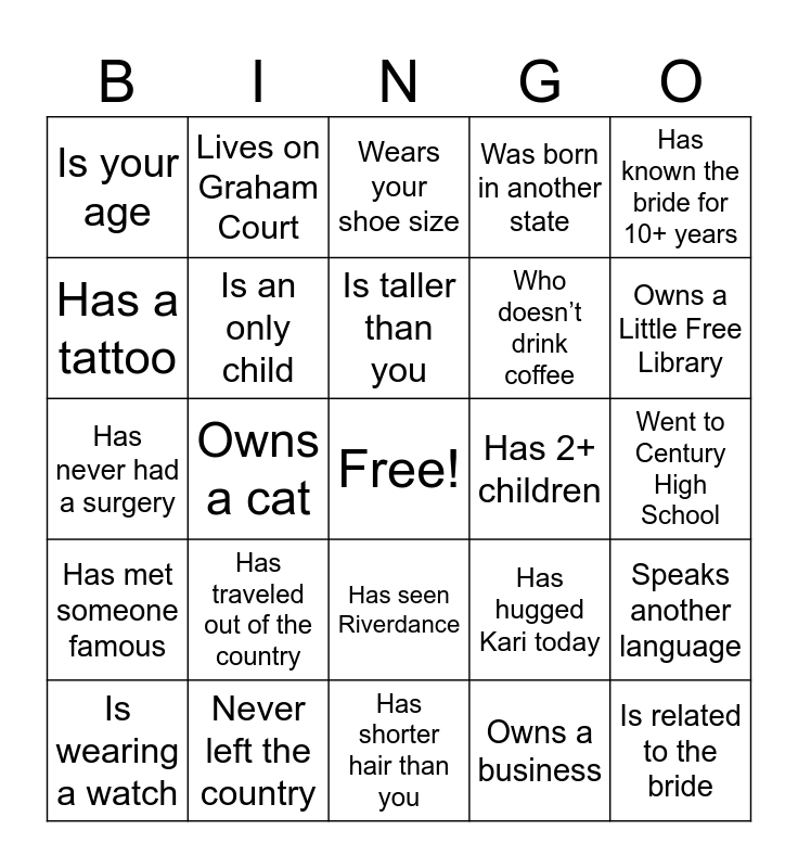 This bingo card has a free space and 59 words: Is wearing green, Never left the country, Is left handed, Has met someone famous, Owns a business, Is retired, Is an only child, Is the youngest in the room, Who doesn’t drink coffee, Plays an instrument, Was born in another state, Is wearing glasses, Has a tattoo, Was born in July, Owns a dog, Is your age, Is related to the bride, Has known the bride for 10+ years, Has curly hair, Is taller than you, Has 2+ children, Wears your shoe size, Is wearing a watch, Speaks another language, Is a twin, Is a teacher, Got married in the past year, Has a vacation planned this year, Owns a Little Free Library, Has their nails painted, Is the oldest child, Has green eyes, Has hazel eyes, Works in a hospital, Lives on Graham Court, Lives in Winona, Has a fish tank, Owns a cat, Has not broken a bone, Has never had a surgery, Was a Girl Scout, Has traveled out of the country, Went to Century High School, Lives in Red Wing, Knows how to crochet, Is a bridesmaid, Has been to a Shania Twain concert, Has been to a Luke Bryan concert, Has seen Riverdance, Has shorter hair than you, Has more than 3 siblings, Has family in Wisconsin, Is wearing a floral print, Has been Kari’s roommate, Has had braces, Has hugged Kari today, Knows how to juggle, Has won more than $100 in slots and Wears orthotics.