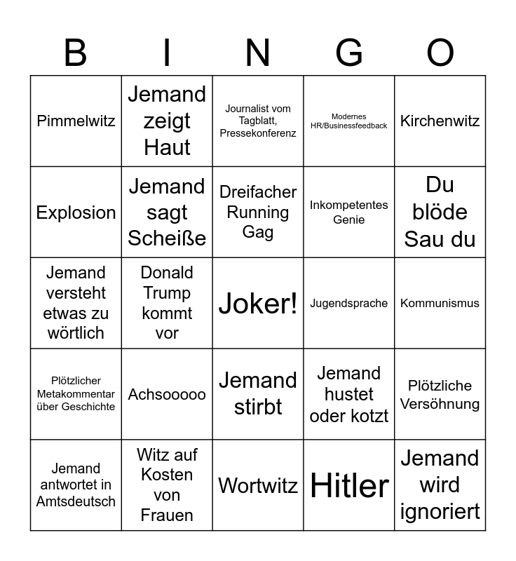 This bingo card has a free space and 24 words: Achsooooo, Witz auf Kosten von Frauen, Dreifacher Running Gag, Jemand antwortet in Amtsdeutsch, Kirchenwitz, Pimmelwitz, Explosion, Jemand zeigt Haut, Jugendsprache, Jemand stirbt, Inkompetentes Genie, Jemand versteht etwas zu wörtlich, Jemand hustet oder kotzt, Plötzliche Versöhnung, Jemand sagt Scheiße, Hitler, Kommunismus, Journalist vom Tagblatt, Pressekonferenz, Du blöde Sau du, Donald Trump kommt vor, Jemand wird ignoriert, Plötzlicher Metakommentar über Geschichte, Modernes HR/Businessfeedback and Wortwitz.