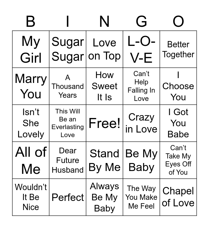 This bingo card has a free space and 24 words: Dear Future Husband, Perfect, How Sweet It Is, Wouldn’t It Be Nice, Better Together, My Girl, Marry You, Sugar Sugar, Crazy in Love, Stand By Me, Can’t Help Falling In Love, Isn’t She Lovely, Be My Baby, Can’t Take My Eyes Off of You, A Thousand Years, The Way You Make Me Feel, I Got You Babe, Love on Top, I Choose You, This Will Be an Everlasting Love, Chapel of Love, All of Me, L-O-V-E and Always Be My Baby.