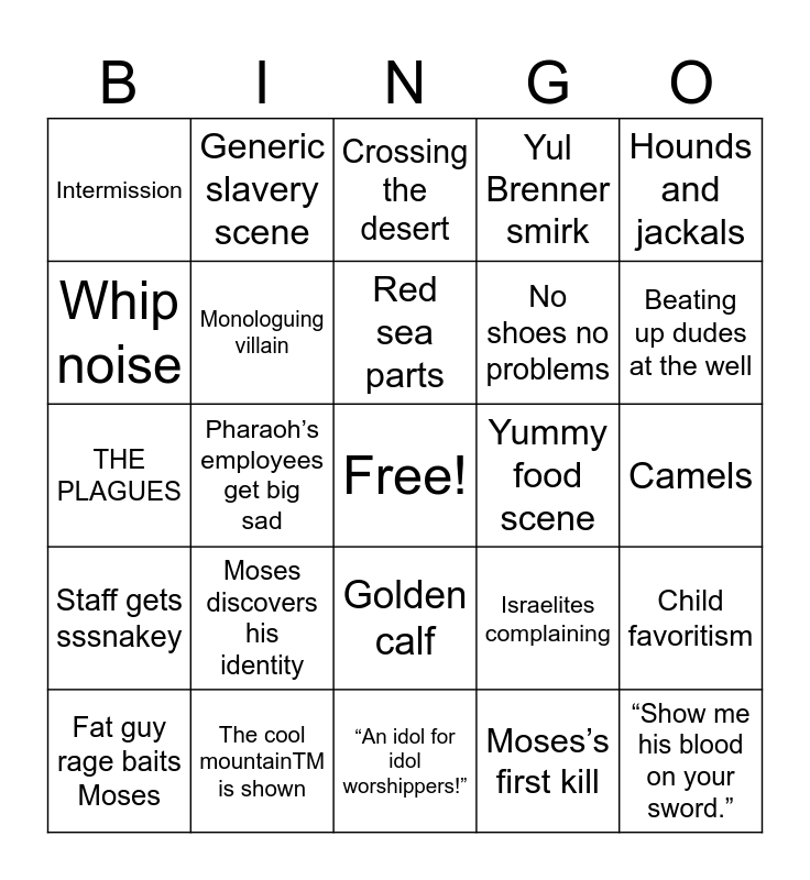 This bingo card has a free space and 34 words: Joshua in chains, Moses’s first kill, “No, not water. Wine~”, Too many people, Staff gets sssnakey, Monologuing villain, Hounds and jackals, Fat guy rage baits Moses, Generic slavery scene, Moses’ real wife appears, Red sea parts, Crossing the desert, Finally got the cool rocks, “Moses~”, Yummy food scene, Beating up dudes at the well, The cool mountainTM is shown, THE PLAGUES, Moses discovers his identity, Israelites complaining, Golden calf, At least one dance scene, Intermission, Camels, “An idol for idol worshippers!”, “Show me his blood on your sword.”, Yul Brenner smirk, Burning bush, No shoes no problems, Whip noise, Raiding the temple granaries, Pharaoh’s employees get big sad, Child favoritism and Long walk off a short balcony.