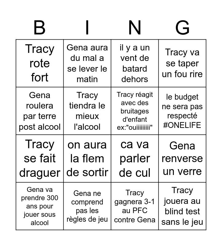 This bingo card has 16 words: Gena ne comprend pas les règles de jeu, Gena renverse un verre, il y a un vent de batard dehors, Tracy rote fort, Tracy se fait draguer, Gena aura du mal a se lever le matin, ca va parler de cul, Tracy gagnera 3-1 au PFC contre Gena, Gena roulera par terre post alcool, Tracy tiendra le mieux l'alcool, Gena va prendre 300 ans pour jouer sous alcool, Tracy va se taper un fou rire, on aura la flem de sortir, le budget ne sera pas respecté #ONELIFE, Tracy réagit avec des bruitages d'enfant ex:"ouiiiiiiiii" and Tracy jouera au blind test sans le jeu.