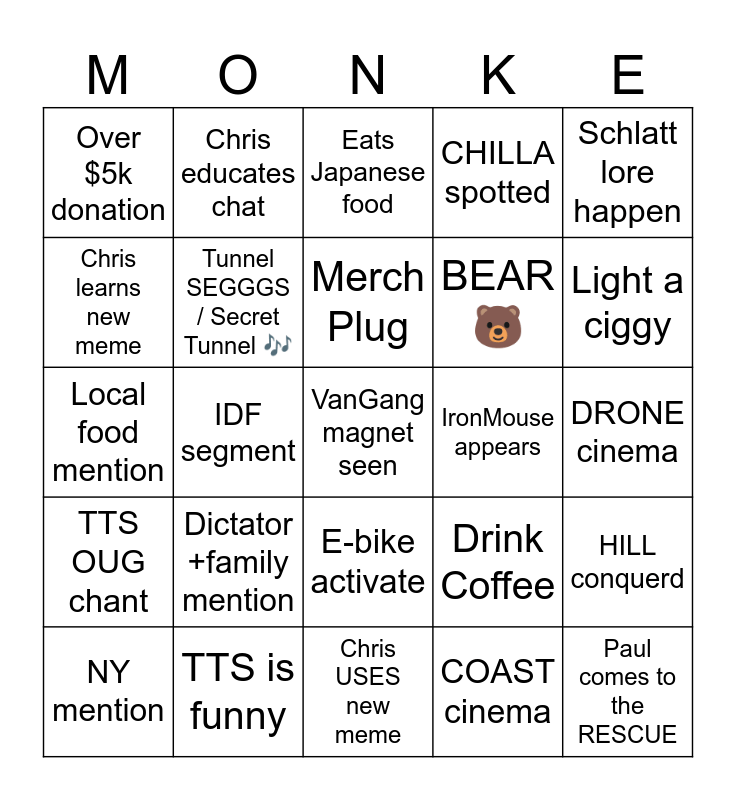 This bingo card has 25 words: Dictator +family mention, Chris USES new meme, Merch Plug, NY mention, Schlatt lore happen, Over $5k donation, Chris learns new meme, Chris educates chat, IronMouse appears, E-bike activate, BEAR 🐻, Local food mention, Drink Coffee, HILL conquerd, Tunnel SEGGGS / Secret Tunnel 🎶, Paul comes to the RESCUE, DRONE cinema, Eats Japanese food, Light a ciggy, IDF segment, VanGang magnet seen, TTS is funny, TTS OUG chant, CHILLA spotted and COAST cinema.