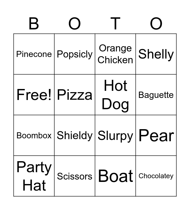 This bingo card has 16 words: Scissors, Pear, Orange Chicken, Pinecone, Boombox, Popsicly, Slurpy, Boat, Free!, Pizza, Party Hat, Shelly, Shieldy, Baguette, Hot Dog and Chocolatey.