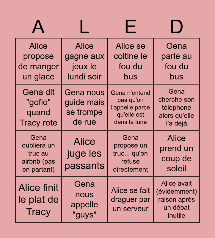 This bingo card has 16 words: Alice finit le plat de Tracy, Gena nous appelle "guys", Alice se coltine le fou du bus, Gena parle au fou du bus, Gena dit "gofio" quand Tracy rote, Alice gagne aux jeux le lundi soir, Gena propose un truc... qu'on refuse directement, Alice prend un coup de soleil, Alice propose de manger un glace, Gena nous guide mais se trompe de rue, Alice se fait draguer par un serveur, Gena cherche son téléphone alors qu'elle l'a déjà, Gena oubliera un truc au airbnb (pas en partant), Alice juge les passants, Gena n'entend pas qu'on l'appelle parce qu'elle est dans la lune and Alice avait (évidemment) raison après un débat inutile.