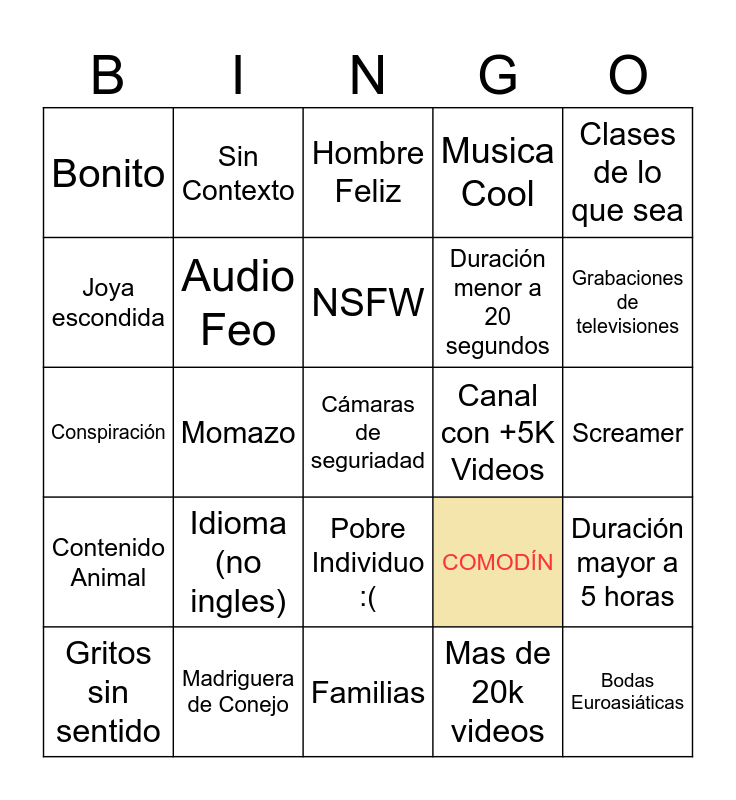 This bingo card has 25 words: Idioma (no ingles), Familias, NSFW, Gritos sin sentido, Clases de lo que sea, Bonito, Joya escondida, Sin Contexto, Canal con +5K Videos, Pobre Individuo :(, Duración menor a 20 segundos, Conspiración, COMODÍN, Duración mayor a 5 horas, Audio Feo, Bodas Euroasiáticas, Screamer, Hombre Feliz, Grabaciones de televisiones, Momazo, Cámaras de seguriadad, Madriguera de Conejo, Contenido Animal, Musica Cool and Mas de 20k videos.