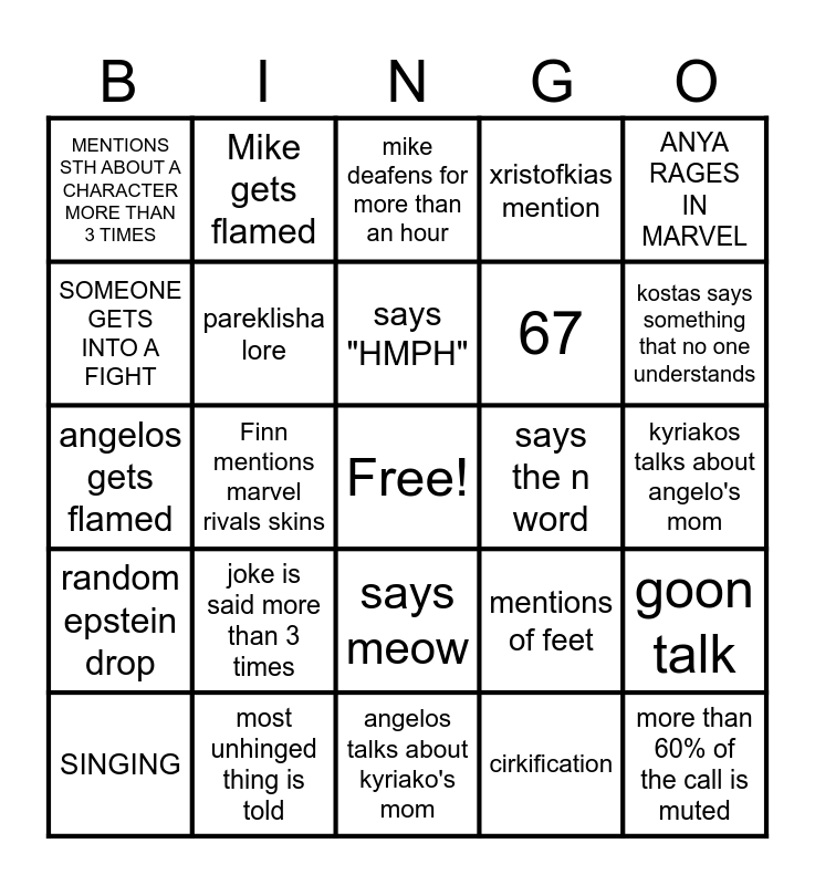 This bingo card has a free space and 24 words: joke is said more than 3 times, most unhinged thing is told, says "HMPH", SINGING, ANYA RAGES IN MARVEL, MENTIONS STH ABOUT A CHARACTER MORE THAN 3 TIMES, SOMEONE GETS INTO A FIGHT, Mike gets flamed, says the n word, says meow, 67, angelos gets flamed, mentions of feet, goon talk, pareklisha lore, cirkification, kyriakos talks about angelo's mom, mike deafens for more than an hour, kostas says something that no one understands, Finn mentions marvel rivals skins, more than 60% of the call is muted, random epstein drop, xristofkias mention and angelos talks about kyriako's mom.