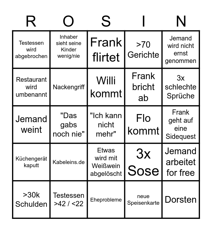 This bingo card has 25 words: Kabeleins.de, Eheprobleme, Willi kommt, >30k Schulden, Jemand wird nicht ernst genommen, Testessen wird abgebrochen, Restaurant wird umbenannt, Inhaber sieht seine Kinder wenig/nie, Flo kommt, Etwas wird mit Weißwein abgelöscht, Frank bricht ab, Jemand weint, 3x Sose, Jemand arbeitet for free, Nackengriff, Dorsten, Frank geht auf eine Sidequest, Frank flirtet, 3x schlechte Sprüche, "Das gabs noch nie", "Ich kann nicht mehr", Testessen >42 / <22, Küchengerät kaputt, >70 Gerichte and neue Speisenkarte.
