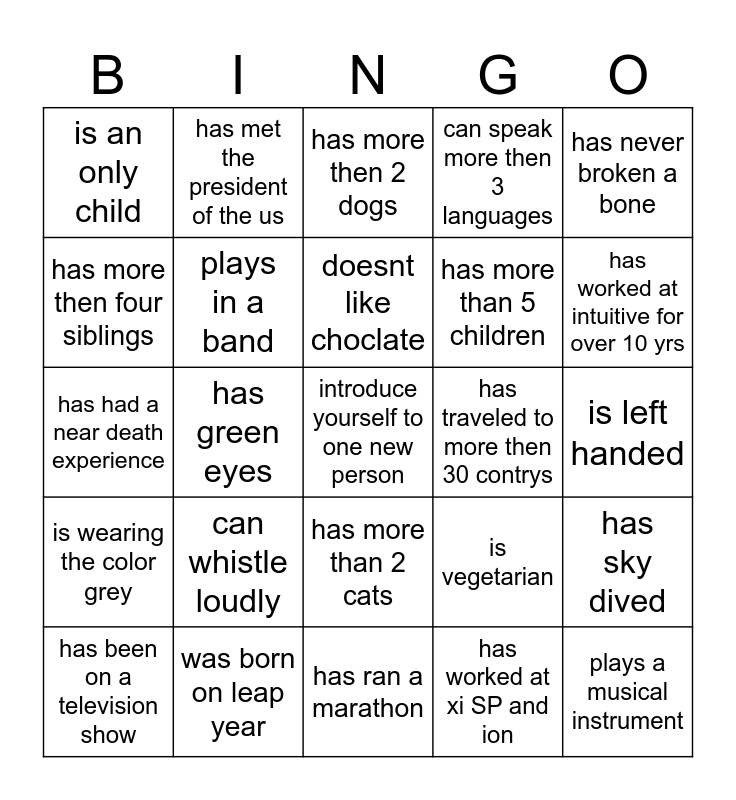 This bingo card has a free space and 24 words: can whistle loudly, was born on leap year, doesnt like choclate, has been on a television show, has never broken a bone, is an only child, has more then four siblings, has met the president of the us, has traveled to more then 30 contrys, has more than 2 cats, has more than 5 children, has had a near death experience, is vegetarian, has sky dived, plays in a band, has worked at xi SP and ion, is left handed, has more then 2 dogs, has worked at intuitive for over 10 yrs, has green eyes, plays a musical instrument, is wearing the color grey, can speak more then 3 languages and has ran a marathon.