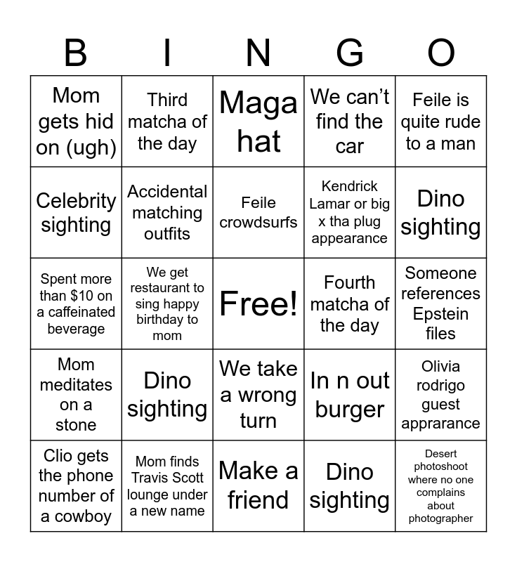 This bingo card has a free space and 24 words: Dino sighting, Mom finds Travis Scott lounge under a new name, Feile crowdsurfs, Clio gets the phone number of a cowboy, Feile is quite rude to a man, Mom gets hid on (ugh), Celebrity sighting, Third matcha of the day, Fourth matcha of the day, We take a wrong turn, Kendrick Lamar or big x tha plug appearance, Spent more than $10 on a caffeinated beverage, In n out burger, Olivia rodrigo guest apprarance, Accidental matching outfits, Dino sighting, Someone references Epstein files, Maga hat, Dino sighting, We get restaurant to sing happy birthday to mom, Desert photoshoot where no one complains about photographer, Mom meditates on a stone, We can’t find the car and Make a friend.