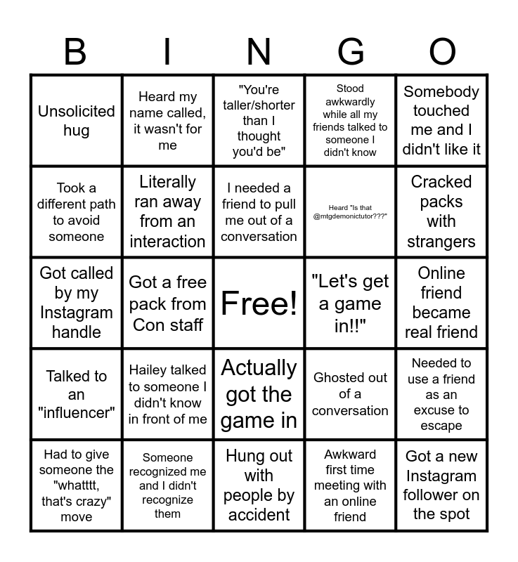 This bingo card has a free space and 24 words: Hailey talked to someone I didn't know in front of me, Someone recognized me and I didn't recognize them, I needed a friend to pull me out of a conversation, Had to give someone the "whatttt, that's crazy" move, Somebody touched me and I didn't like it, Unsolicited hug, Took a different path to avoid someone, Heard my name called, it wasn't for me, "Let's get a game in!!", Actually got the game in, Heard "Is that @mtgdemonictutor???", Got called by my Instagram handle, Ghosted out of a conversation, Needed to use a friend as an excuse to escape, Literally ran away from an interaction, Awkward first time meeting with an online friend, Online friend became real friend, "You're taller/shorter than I thought you'd be", Cracked packs with strangers, Got a free pack from Con staff, Got a new Instagram follower on the spot, Talked to an "influencer", Stood awkwardly while all my friends talked to someone I didn't know and Hung out with people by accident.