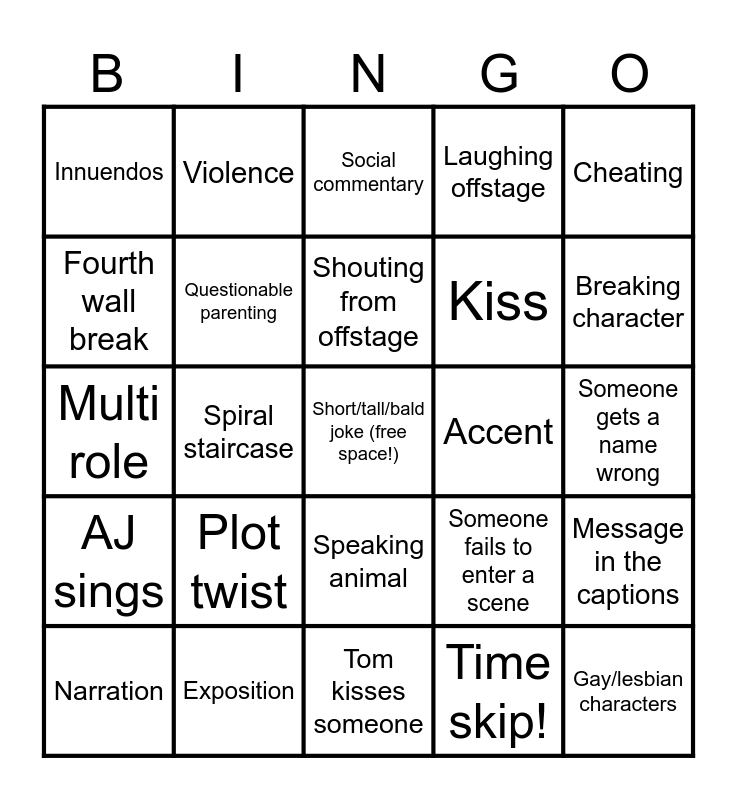 This bingo card has a free space and 34 words: Different language spoken, Luke Womanning, AJ is confused, Someone makes a snarky correction, Someone gets a name wrong, Fourth wall break, Questionable parenting, Tom kisses someone, Kiss, Gay/lesbian characters, Multi role, Violence, Time skip!, Poetry, AJ sings, Spiral staircase, Speaking animal, Accent, Message in the captions, Narration, Exposition, Audience participation, Laughing offstage, Breaking character, Child character, Plot twist, Social commentary, Dead/missing parent, Cheating, Innuendos, History/shakespeare reference, Shouting from offstage, Someone fails to enter a scene and Gremlin Luke.