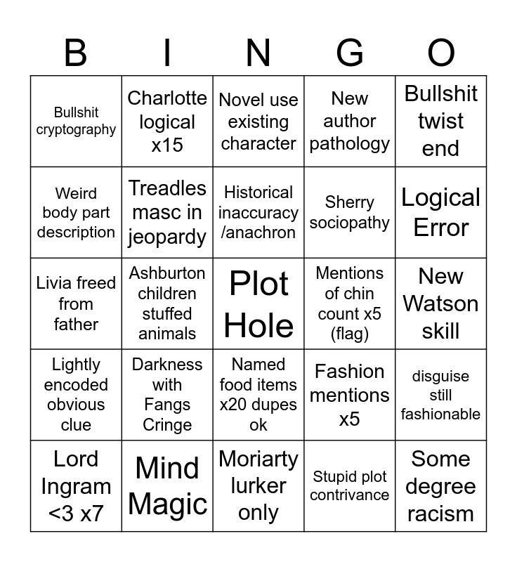 This bingo card has a free space and 24 words: Darkness with Fangs Cringe, Mind Magic, Historical inaccuracy /anachron, Lord Ingram <3 x7, Bullshit twist end, Bullshit cryptography, Weird body part description, Charlotte logical x15, Mentions of chin count x5 (flag), Named food items x20 dupes ok, Sherry sociopathy, Livia freed from father, Fashion mentions x5, disguise still fashionable, Treadles masc in jeopardy, Stupid plot contrivance, New Watson skill, Novel use existing character, Logical Error, Ashburton children stuffed animals, Some degree racism, Lightly encoded obvious clue, New author pathology and Moriarty lurker only.