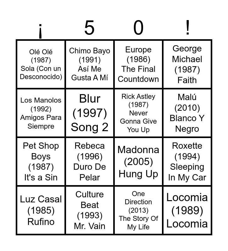 This bingo card has 86 words: Bizarrap Y Quevedo (2022) Quevedo: BZRP Musis Sessions, Vol.52, Harry Styles (2022) As It Was, Rosalía (2022) Despechá, Farruko (2021) Pepas, Zzoilo Y Aitana (2021) Mon Amour, 24kGoldn feat lann Dior (2020) Mood, Mabel (2019) Don't Call Me Up, Marshmello & Anne-Marie (2018) Friends, Becky G. Y Bad Bunny (2017) Mayores, Leiva (2016) Sincericidio, Adele (2015) Hello, Nicki Minaj ft Ariana Grande & Jessie J (2014) Bang Bang, Taylor Swift (2014) Shake It Off, One Direction (2013) The Story Of My Life, Alicia Keys (2012) Girl on fire, Malú (2010) Blanco Y Negro, Juan Magán (2011) Bailando Por Ahí, Lady Gaga (2009) Bad Romance, Black Eyed Peas (2009 I Gotta Feeling, Beyoncé (2008) Single Ladies (Put A Ring On It), Rihanna (2007) Umbrella, Dover (2006) Let Me Out, Madonna (2005) Hung Up, Shakira Y Alejandro Sanz (2005) La Tortura, Camela (2004) Cuando Zarpa El Amor, U2 (2004) Vertigo, Andy Y Lucas (2003) Son De Amores, David Civera (2002) Que La Detengan, Chenoa (2002) Cuando Tú Vas, Melody (2001) El Baile Del Gorila, Thalia (2000) Arrasando, Jennifer Lopez (1999) Una Noche Más, Joaquín Sabina (1999) 19 Días y 500 Noches, Extremoduro (1998) Salir, Blur (1997) Song 2, Spice Girls (1996) Wannabe, Rebeca (1996) Duro De Pelar, Alanis Morrisette (1995) Ironic, Proyecto Uno (1995) El Tiburón, Roxette (1994) Sleeping In My Car, Luis Miguel (1993) Suave, Aerosmith (1993) Cryin', Whigfield (1993) Saturday Night, Culture Beat (1993) Mr. Vain, OBK (1992) Historias de Amor, Los Manolos (1992) Amigos Para Siempre, Rosario Flores (1992) Mi Gato, Chimo Bayo (1991) Así Me Gusta A Mí, Celtas Cortos (1991) Cuéntame Un Cuento, Juan Luís Guerra (1990) La Bilirrubina, Mc Hammer (1990) U Can't Touch This, New Kids On The Block (1990) Step by Step, Locomia (1989) Locomia, Phil Collins (1989) Another Day in Paradise, Isabel Pantoja (1989) Se Me Enamora El Alma, Hombres G (1988) Suéltate El Pelo, Los Rebeldes (1988) Mediterraneo, Pet Shop Boys (1987) It's a Sin, George Michael (1987) Faith, Rick Astley (1987) Never Gonna Give You Up, Olé Olé (1987) Sola (Con un Desconocido), Bon Jovi (1986) Livin' On a Prayer, Duncan Dhu (1986) Cien Gaviotas, The Communards (1986) Don't Leave Me This Way, Alaska Y Dinarama (1986) A Quién Le Importa, Europe (1986) The Final Countdown, Desireless (1986) Voyage, Voyage, Luz Casal (1985) Rufino, Alphaville (1984) Forever Young, Eurythmics (1983) Sweet Dreams (Are Made Of This), Miguel Ríos (1982) Bienvenidos, Paloma San Basilio (1981) Juntos, Pino D'Angiò (1981) Ma Quale Idea, Orquesta Mondragón (1980) Viaje con nosotros, Pecos (1979) Hablame De Ti, Kiss (1979) I Was Made For Lovin'you, Village People (1978) Y.M.C.A., Bee Gees (1977) Stayin' Alive, Abba (1975) Mamma Mia, Los Chichos (1974) Ni Más, Ni Menos, Jeanette (1974) ¿Por Qué Te Vas?, Nino Bravo (1973) América, América, Don McLean (1971) American Pie, Peret (1971) Borriquito Como Tú, Mari Trini (1971) Yo No Soy Esa and The Beatles (1970) Let It Be.