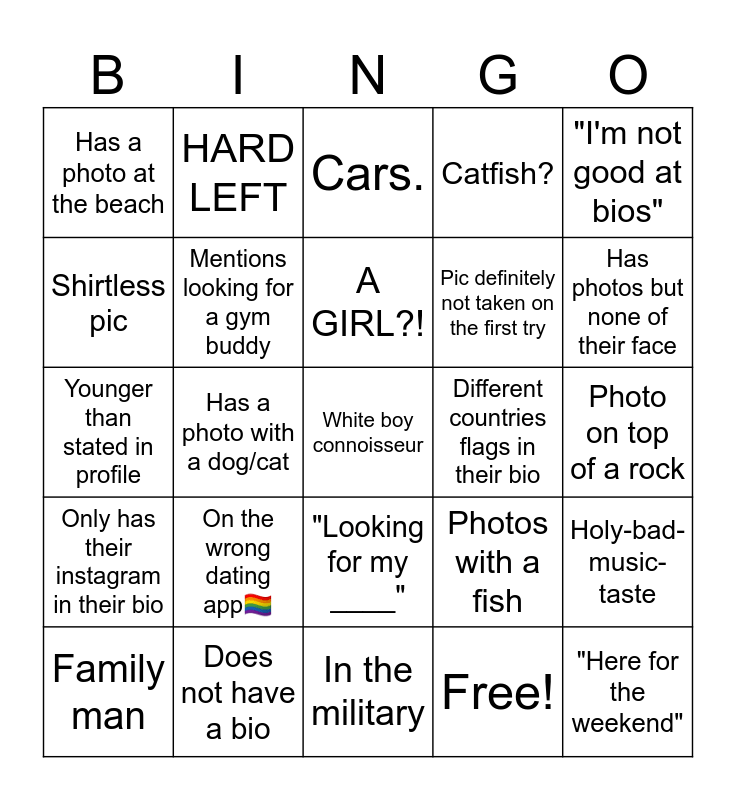 This bingo card has 30 words: Does not have a bio, Only has group photos, Has a photo with a dog/cat, "Just ask", Has a photo at the beach, Cars., Mentions looking for a gym buddy, "Looking for my ____", Different countries flags in their bio, In the military, Photo on top of a rock, White boy connoisseur, Free!, "Here for the weekend", Has photos but none of their face, Has 3 photos and none are of them, Photos with a fish, Only has their instagram in their bio, On the wrong dating app🏳️🌈, "I'm not good at bios", Younger than stated in profile, It's a couple looking for a third, HARD LEFT, Pic definitely not taken on the first try, Shirtless pic, Catfish?, Holy-bad- music-taste, Family man, A GIRL?! and "Your mom will love me".