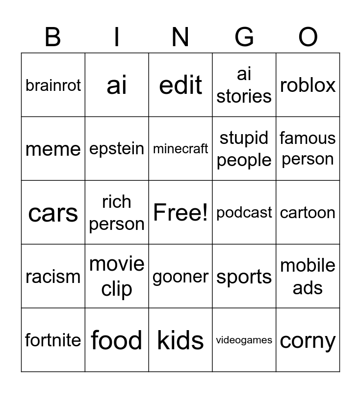 This bingo card has a free space and 24 words: movie clip, food, minecraft, fortnite, roblox, brainrot, meme, ai, podcast, gooner, stupid people, cars, sports, mobile ads, epstein, videogames, cartoon, edit, famous person, rich person, corny, racism, ai stories and kids.