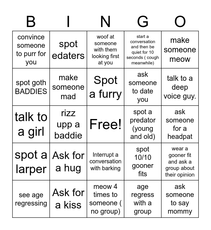 This bingo card has a free space and 24 words: Ask for a hug, Ask for a kiss, Spot a furry, see age regressing, make someone meow, convince someone to purr for you, spot goth BADDIES, spot edaters, spot a predator (young and old), Interrupt a conversation with barking, ask someone to date you, talk to a girl, spot 10/10 gooner fits, wear a gooner fit and ask a group about their opinion, make someone mad, age regress with a group, ask someone for a headpat, woof at someone with them looking first at you, talk to a deep voice guy., rizz upp a baddie, ask someone to say mommy, spot a larper, start a conversation and then be quiet for 10 seconds ( cough meanwhile) and meow 4 times to someone ( no group).