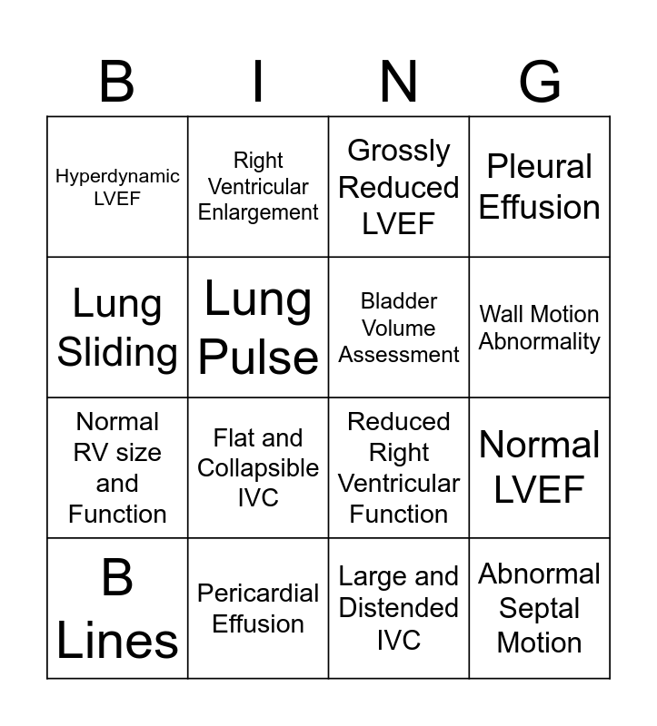 This bingo card has 16 words: Pericardial Effusion, Normal LVEF, Grossly Reduced LVEF, Hyperdynamic LVEF, Normal RV size and Function, Right Ventricular Enlargement, Reduced Right Ventricular Function, Large and Distended IVC, Lung Sliding, Lung Pulse, B Lines, Pleural Effusion, Flat and Collapsible IVC, Wall Motion Abnormality, Bladder Volume Assessment and Abnormal Septal Motion.