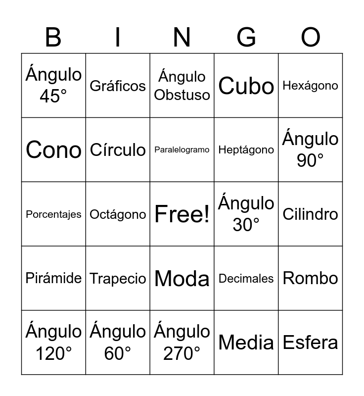 This bingo card has a free space and 38 words: Triángulo, Cuadrado, Rectángulo, Círculo, Rombo, Trapecio, Paralelogramo, Pentágono, Hexágono, Heptágono, Octágono, Cubo, Esfera, Cilindro, Cono, Pirámide, Ángulo Agudo, Ángulo Obstuso, Ángulo Extendido, Ángulo 30°, Ángulo 45°, Ángulo 60°, Ángulo 90°, Ángulo 120°, Ángulo 180°, Ángulo 270°, Ángulo 360°, Números naturales, Números enteros, Números racionales, Números reales, Moda, Media, Gráficos, Fracción, Decimales, Porcentajes and Número primo.