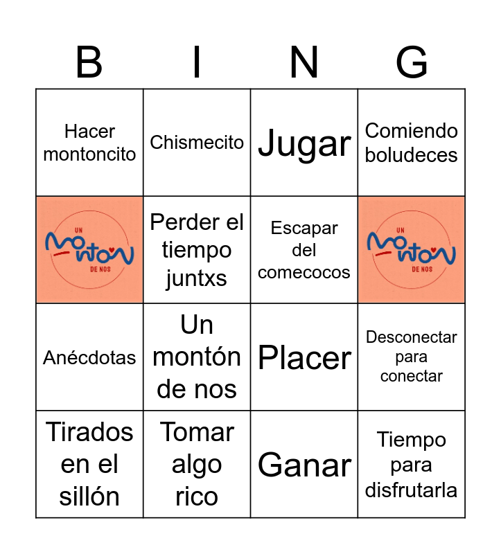 This bingo card has 4 images and 29 words: Free!, Desconectar para conectar, Comida rica, Tiempo para disfrutarla, Escapar del comecocos, Reposera, Chismecito, Felicidad, Jugar, Brindar, Un montón de risas, Tomar algo rico, Juegos de mesa, Tarde de rummy, Placer, Risas compartidas, Vino, Salida con amigxs, Divertirme, Ganar, Ver series malas, Tirados en el sillón, Comiendo boludeces, Anécdotas, Perder el tiempo juntxs, Hacer montoncito, El reloj no corre, Rincón de la ciudad and Un montón de nos.