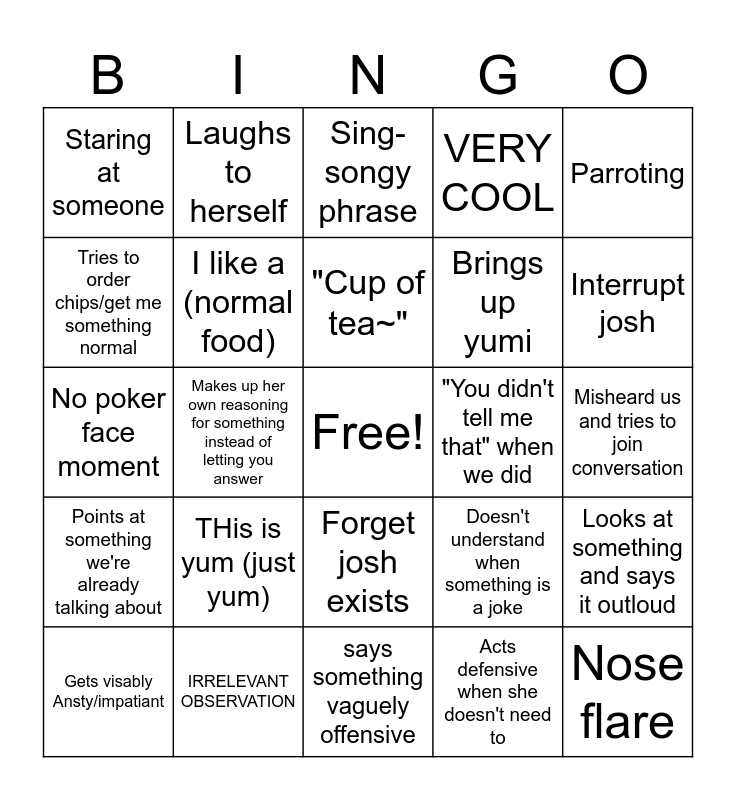 This bingo card has a free space and 28 words: Looks at something and says it outloud, Repeats something she said earlier, Brings up yumi, Acts defensive when she doesn't need to, Tries to order chips/get me something normal, Sing-songy phrase, Laughs to herself, Points at something we're already talking about, "You didn't tell me that" when we did, Gets visably Ansty/impatiant, No poker face moment, VERY COOL, IRRELEVANT OBSERVATION, says something vaguely offensive, Interrupt josh, Saying things without context, THis is yum (just yum), I like a (normal food), "Cup of tea~", Forget josh exists, Staring at someone, Accusing us of being horrid, Nose flare, Makes up her own reasoning for something instead of letting you answer, Misheard us and tries to join conversation, Doesn't understand when something is a joke, Parroting and Subtle middle finger.
