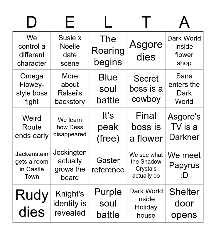 This bingo card has a free space and 24 words: Jockington actually grows the beard, Knight's identity is revealed, Blue soul battle, Rudy dies, Dark World inside flower shop, We control a different character, Omega Flowey-style boss fight, Susie x Noelle date scene, Final boss is a flower, Gaster reference, Secret boss is a cowboy, Weird Route ends early, We see what the Shadow Crystals actually do, We meet Papyrus :D, More about Ralsei's backstory, Dark World inside Holiday house, Asgore's TV is a Darkner, The Roaring begins, Sans enters the Dark World, We learn how Dess disappeared, Shelter door opens, Jackenstein gets a room in Castle Town, Asgore dies and Purple soul battle.