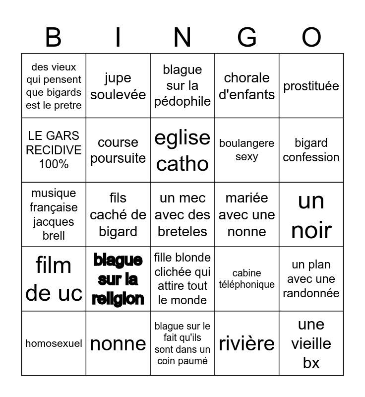 This bingo card has a free space and 24 words: blague sur la religion, nonne, eglise catho, homosexuel, prostituée, des vieux qui pensent que bigards est le pretre, LE GARS RECIDIVE 100%, jupe soulevée, mariée avec une nonne, fille blonde clichée qui attire tout le monde, boulangere sexy, musique française jacques brell, cabine téléphonique, un plan avec une randonnée, course poursuite, rivière, un noir, blague sur la pédophile, bigard confession, fils caché de bigard, une vieille bx, film de uc, chorale d'enfants and blague sur le fait qu'ils sont dans un coin paumé.