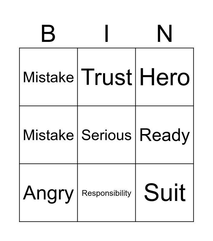 This bingo card has a free space and 11 words: Mistake, Responsibility, Suit, Angry, Trust, Hero, Ready, Problem, Mistake, Mistake and Mistake.