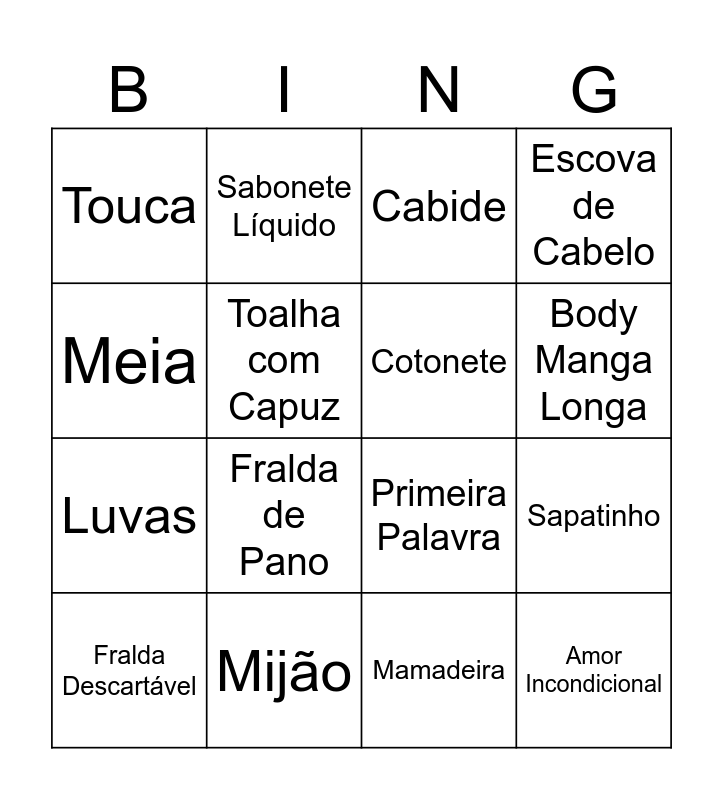 This bingo card has 50 words: Free!, Fralda Descartável, Lenço Umedecido, Pomada de Assadura, Talco, Shampoo de Bebê, Sabonete Líquido, Banheira, Toalha com Capuz, Algodão, Cotonete, Escova de Cabelo, Cortador de Unha, Termômetro, Álcool 70%, Body Manga Curta, Body Manga Longa, Mijão, Macacão, Meia, Sapatinho, Babador, Touca, Luvas, Manta, Cueiro, Fralda de Pano, Paninho de Boca, Cabide, Berço, Chupeta, Mordedor, Chocalho, Móbile, Urso de Pelúcia, Naninha, Almofada de Amamentação, Trocador, Babá Eletrônica, Mamadeira, Escova de Mamadeira, Copo, Pratinho, Ultrassom, Chá de Revelação, Primeira Palavra, Primeiros Passos, Noite em Claro, Amor Incondicional and Olívia.