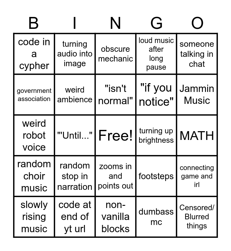 This bingo card has a free space and 24 words: random stop in narration, code at end of yt url, "isn't normal", slowly rising music, someone talking in chat, code in a cypher, government association, turning audio into image, turning up brightness, zooms in and points out, "if you notice", weird robot voice, footsteps, connecting game and irl, weird ambience, dumbass mc, MATH, obscure mechanic, Jammin Music, "'Until...", Censored/ Blurred things, random choir music, loud music after long pause and non-vanilla blocks.