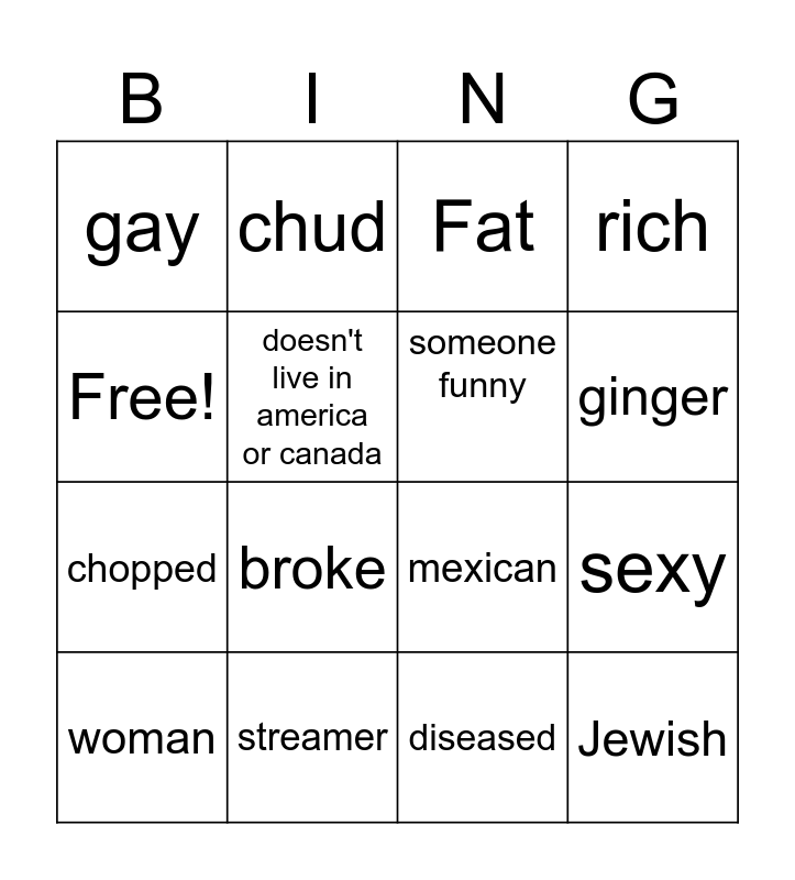 This bingo card has 16 words: streamer, sexy, Fat, gay, chopped, chud, mexican, diseased, Free!, doesn't live in america or canada, woman, rich, broke, ginger, someone funny and Jewish.