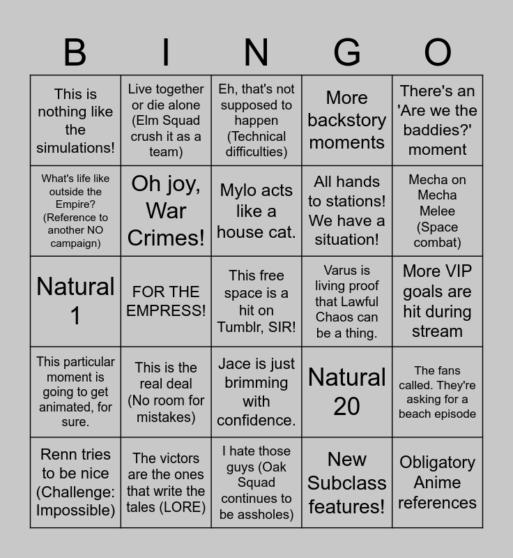 This bingo card has a free space and 24 words: This is the real deal (No room for mistakes), The victors are the ones that write the tales (LORE), Mylo acts like a house cat., Renn tries to be nice (Challenge: Impossible), There's an 'Are we the baddies?' moment, This is nothing like the simulations!, What's life like outside the Empire? (Reference to another NO campaign), Live together or die alone (Elm Squad crush it as a team), Varus is living proof that Lawful Chaos can be a thing., Jace is just brimming with confidence., All hands to stations! We have a situation!, Natural 1, Natural 20, The fans called. They're asking for a beach episode, Oh joy, War Crimes!, New Subclass features!, More VIP goals are hit during stream, Eh, that's not supposed to happen (Technical difficulties), Mecha on Mecha Melee (Space combat), FOR THE EMPRESS!, Obligatory Anime references, This particular moment is going to get animated, for sure., More backstory moments and I hate those guys (Oak Squad continues to be assholes).