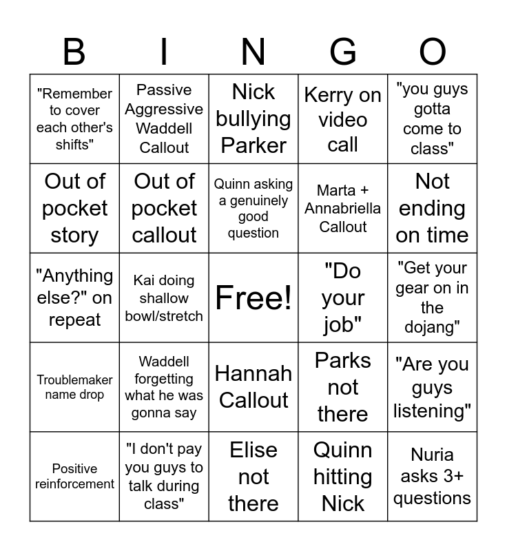 This bingo card has a free space and 24 words: Waddell forgetting what he was gonna say, "I don't pay you guys to talk during class", Quinn asking a genuinely good question, Positive reinforcement, "you guys gotta come to class", "Remember to cover each other's shifts", Out of pocket story, Passive Aggressive Waddell Callout, "Do your job", Hannah Callout, Marta + Annabriella Callout, "Anything else?" on repeat, Parks not there, "Are you guys listening", Out of pocket callout, Quinn hitting Nick, "Get your gear on in the dojang", Nick bullying Parker, Not ending on time, Kai doing shallow bowl/stretch, Nuria asks 3+ questions, Troublemaker name drop, Kerry on video call and Elise not there.