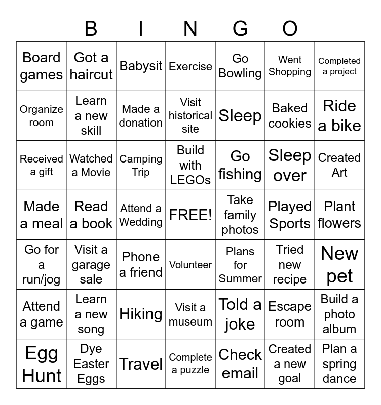 This bingo card has a free space and 48 words: Go for a run/jog, Read a book, Travel, Volunteer, Sleep, Played Sports, Completed a project, Egg Hunt, Watched a Movie, Attend a Wedding, Exercise, Go Bowling, Sleep over, Created Art, Made a meal, Learn a new song, Babysit, Build with LEGOs, Told a joke, Went Shopping, Ride a bike, Organize room, Got a haircut, Made a donation, Check email, Baked cookies, Plant flowers, Attend a game, Visit a garage sale, Camping Trip, Visit a museum, Go fishing, Escape room, Build a photo album, Board games, Dye Easter Eggs, Phone a friend, Complete a puzzle, Take family photos, Created a new goal, New pet, Received a gift, Learn a new skill, Hiking, Visit historical site, Plans for Summer, Tried new recipe and Plan a spring dance.